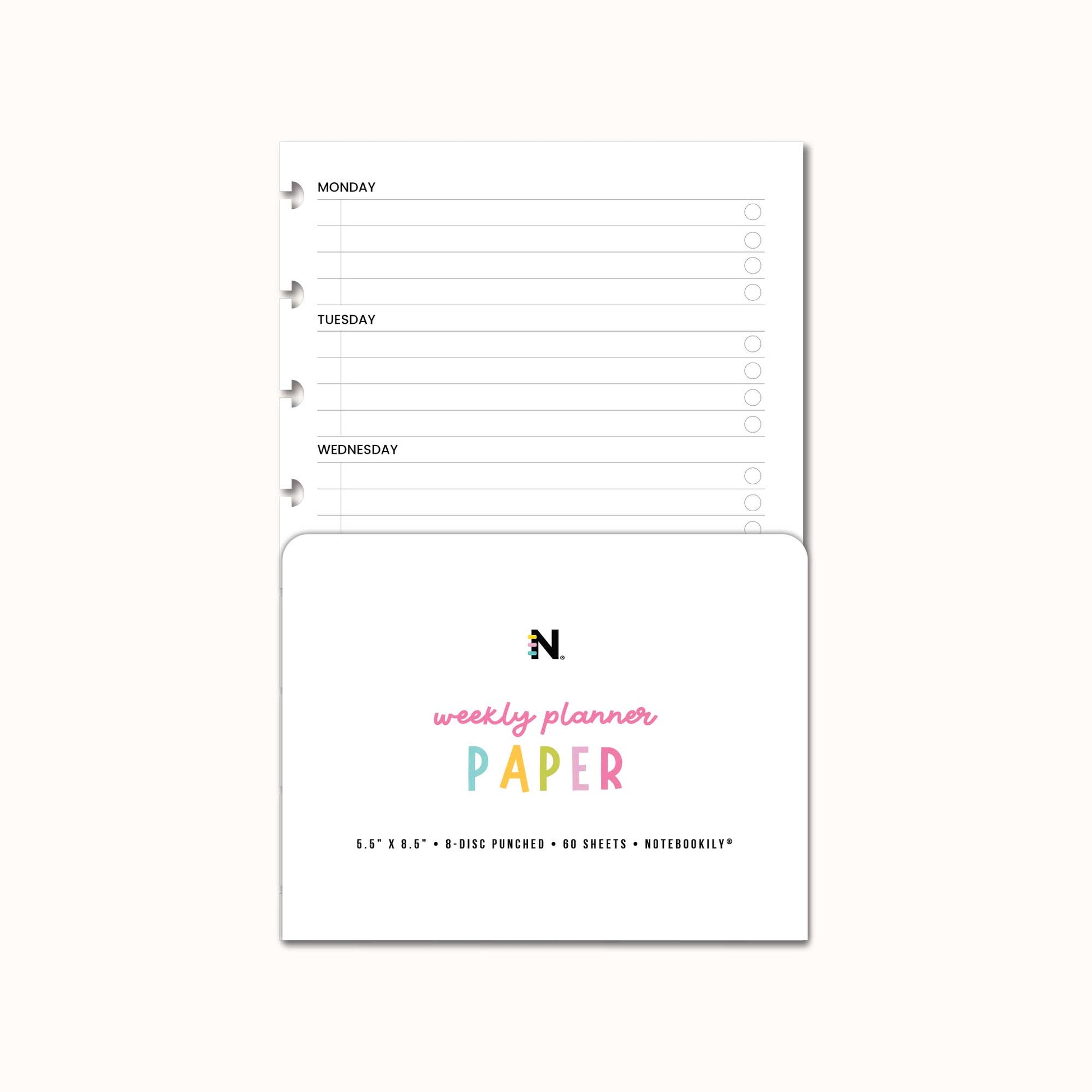 Monday start weekly planner inserts. Features weekly planner front and lined notes back.